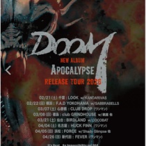 DOOM New Album "APOCALYPSE" Release Tour 2026<日程>2026年2月22日(日)OPEN 17:00 START 17:30開場:横浜 F.A.D YOKOHAMAチケット:◉前売7,000円入場時1ドリンク代必要※チケットはいかなる理由でも返品・返金・交換ができません。公演の詳細はコチラ!DOOM New Albu ...